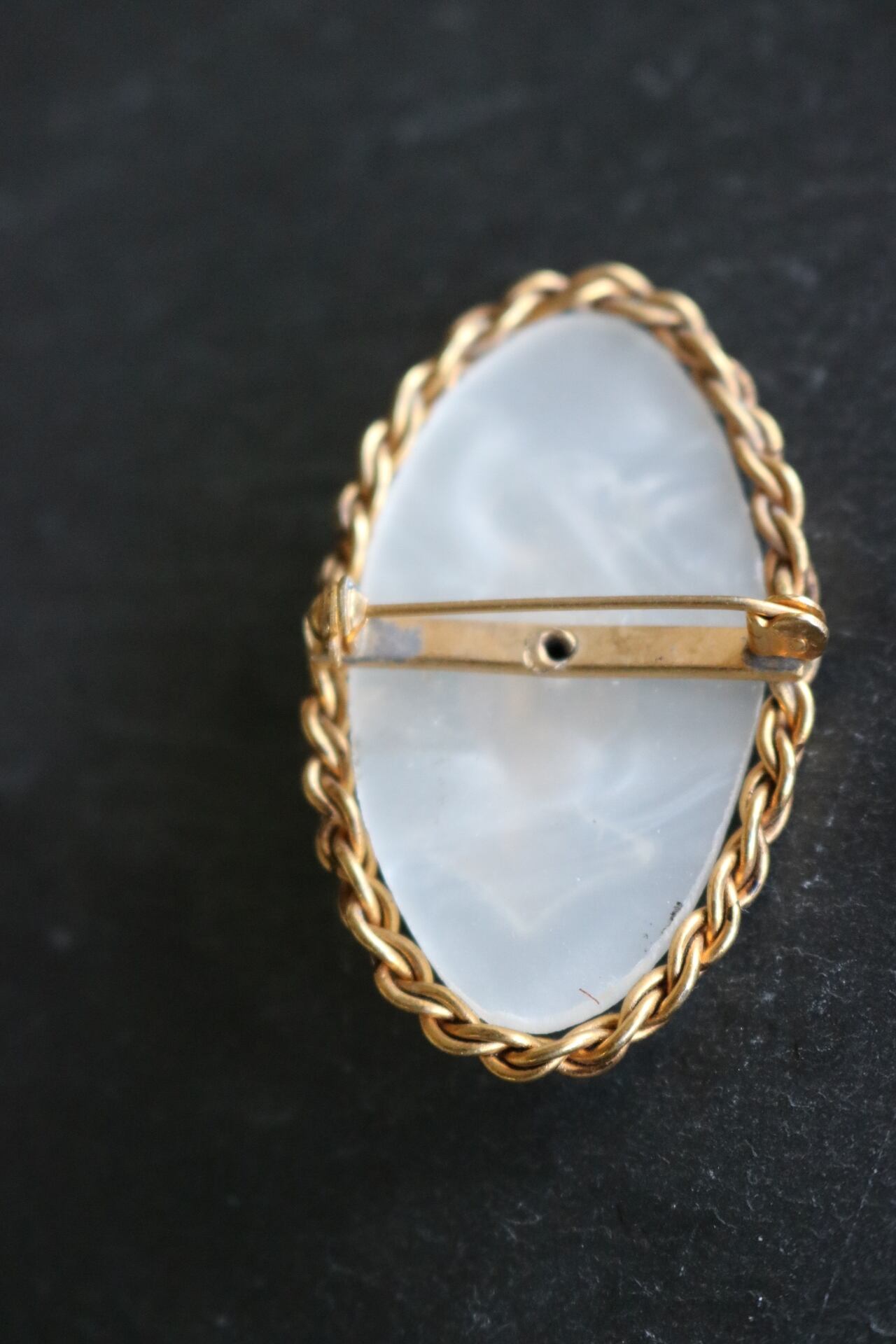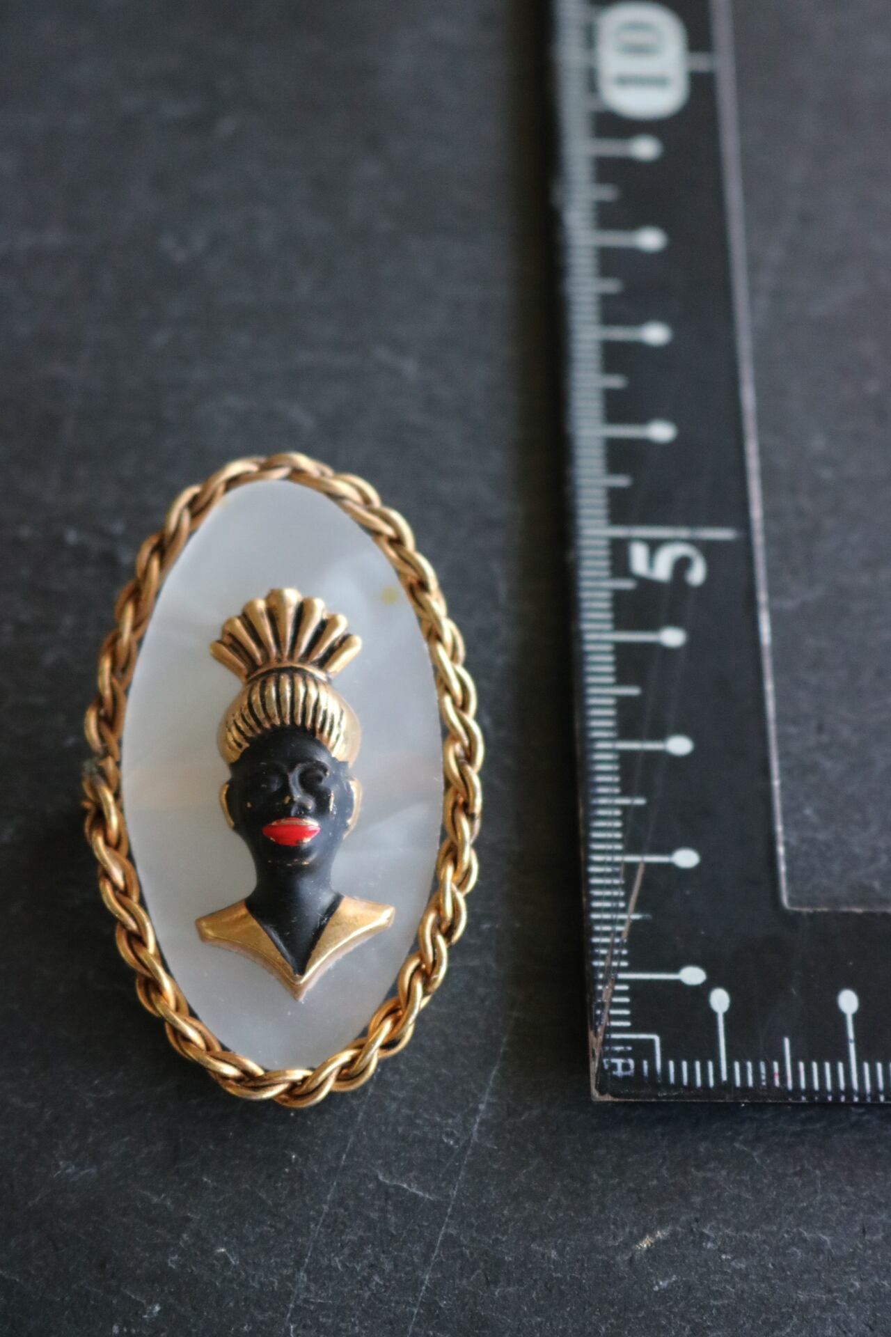 白蝶貝の上に貴婦人のモチーフがついています。